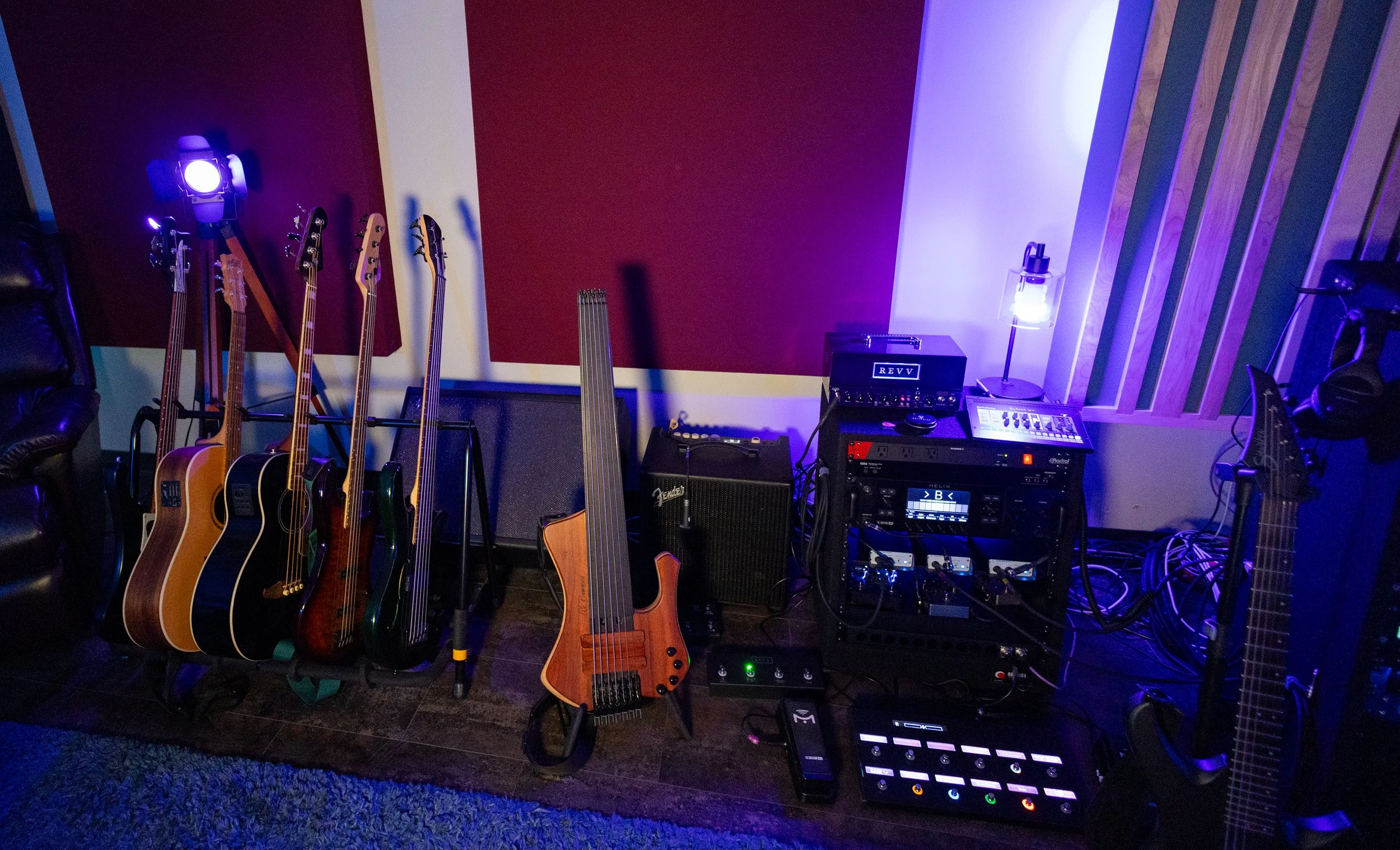 My instruments reflect my eclectic background as a musician. I’ve got 6- and 12-string acoustics from Matin and Taylor. A high-end 6-string from Balaguer, a Schecter 7-string, and a Shuriken that integrates with the studio’s Helix system. And basses with four, five, six, and even seven strings, with and without frets, even and upright electric.